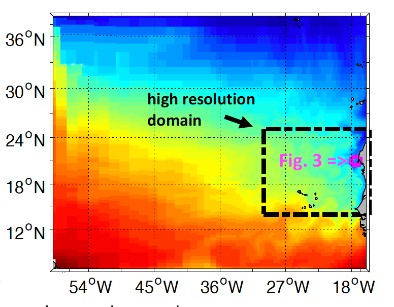 MOMA is a coupled biogeochemical ocean model configuration of the Atlantic Ocean off Mauretania, a region renown for its complex ocean circulation driven by seasonal wind patterns, coastal upwelling and peculiar mode water eddies featuring toxic levels of dissolved oxygen. MOMA exists in four different spatial resolutions, ranging from 1.5 km to 12 km.